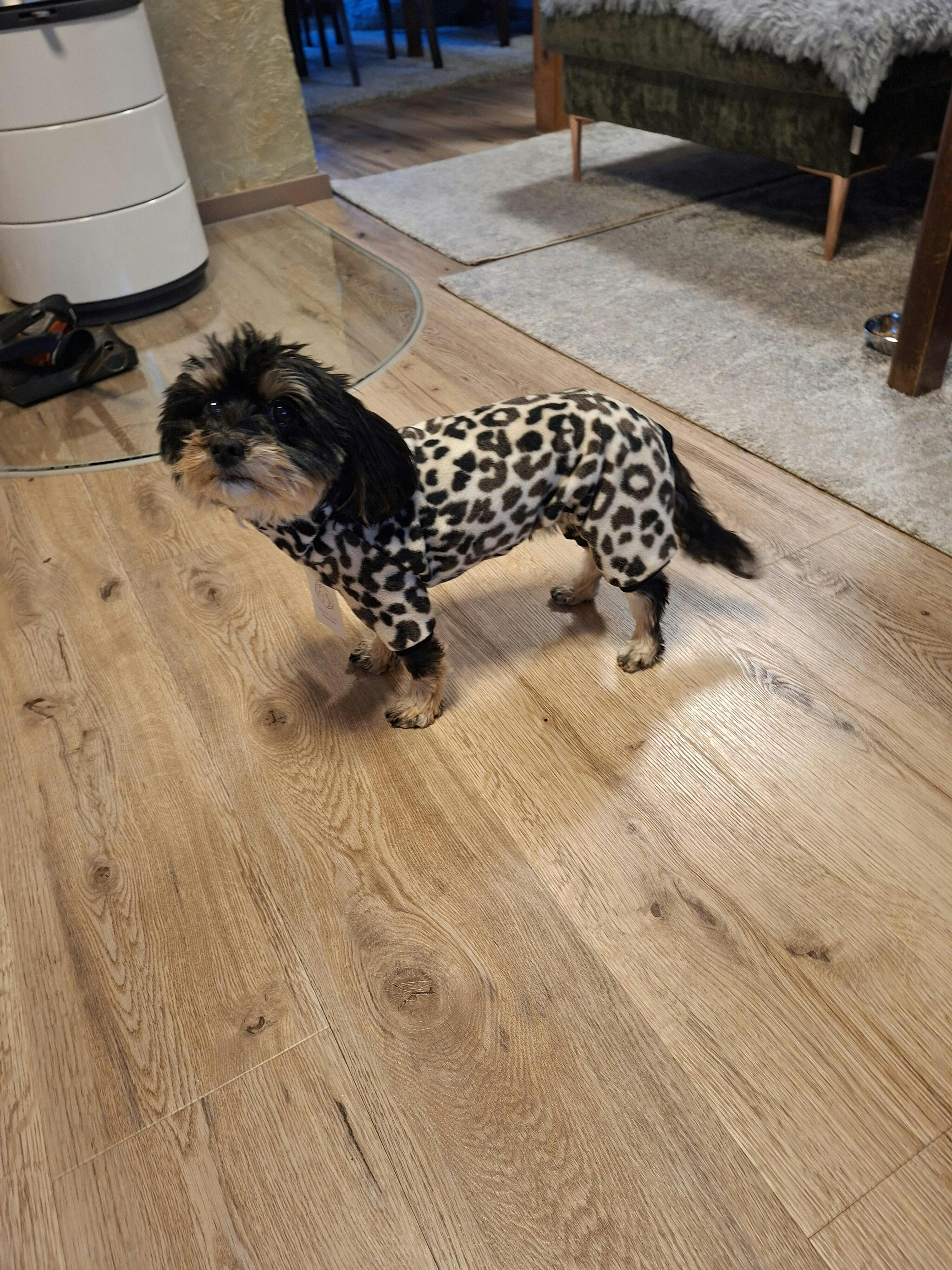 Für kleine Wildfänge mit langem Rücken: Der Polar Fleece Overall im Leo-Look hält deinen Dackel kuschelig warm, bleibt leicht & atmungsaktiv und macht jede Bewegung mit – von der Cityrunde bis zur Sofa-Safari.